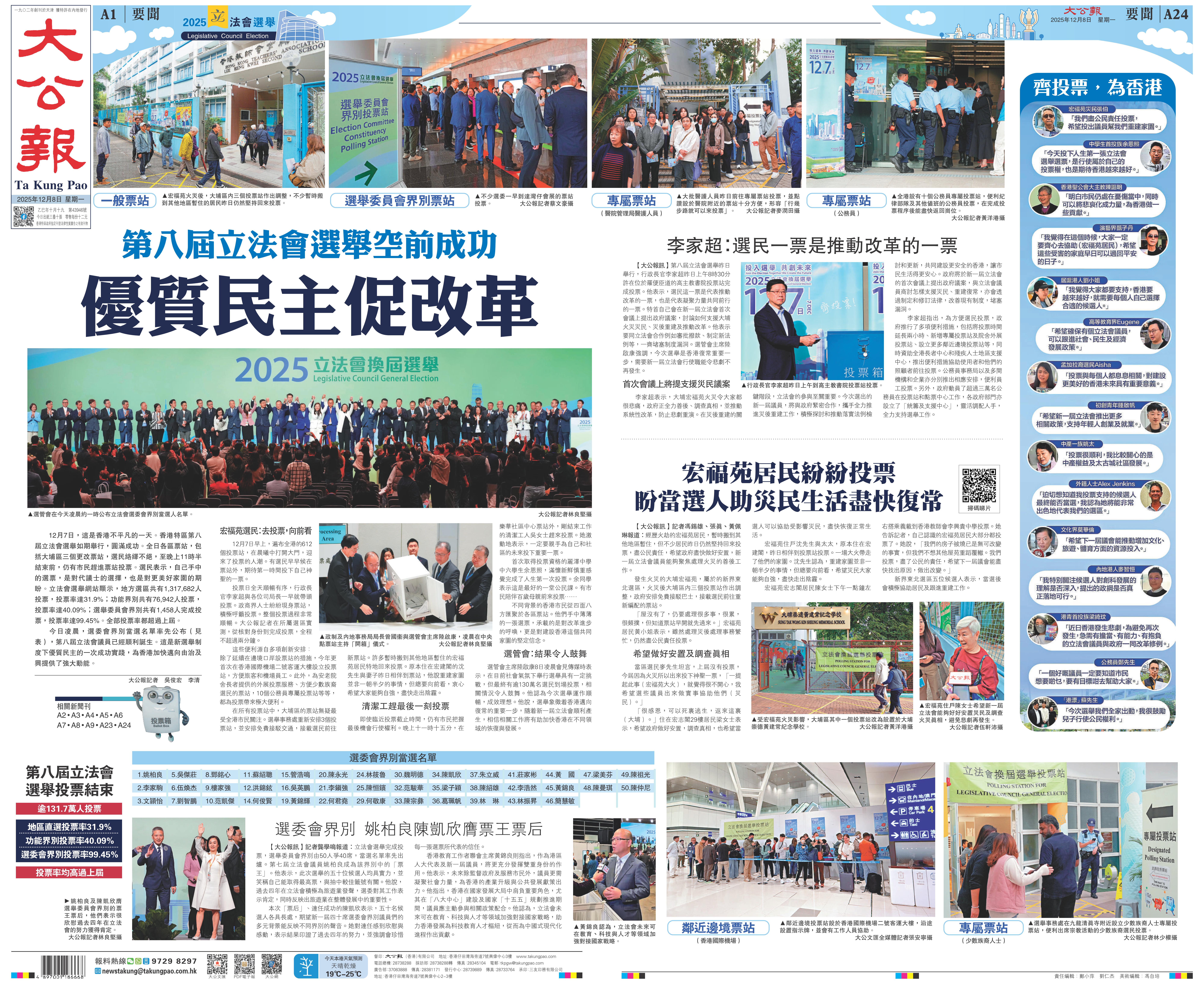 香港特別行政區(qū)第八屆立法會選舉投票于7日23時30分結束。12月8日清晨,經(jīng)過點票,分區(qū)直接選舉界別的20名議員最終成功選出,至此,加上8日稍早時的選舉委員會界別40席、功能團體界別30席,本次香港特區(qū)立法會選舉需要選出的90名立法會議員已全部選出。這是香港在完善選舉制度、落實“愛國者治港”原則后舉行的又一次重要選舉。