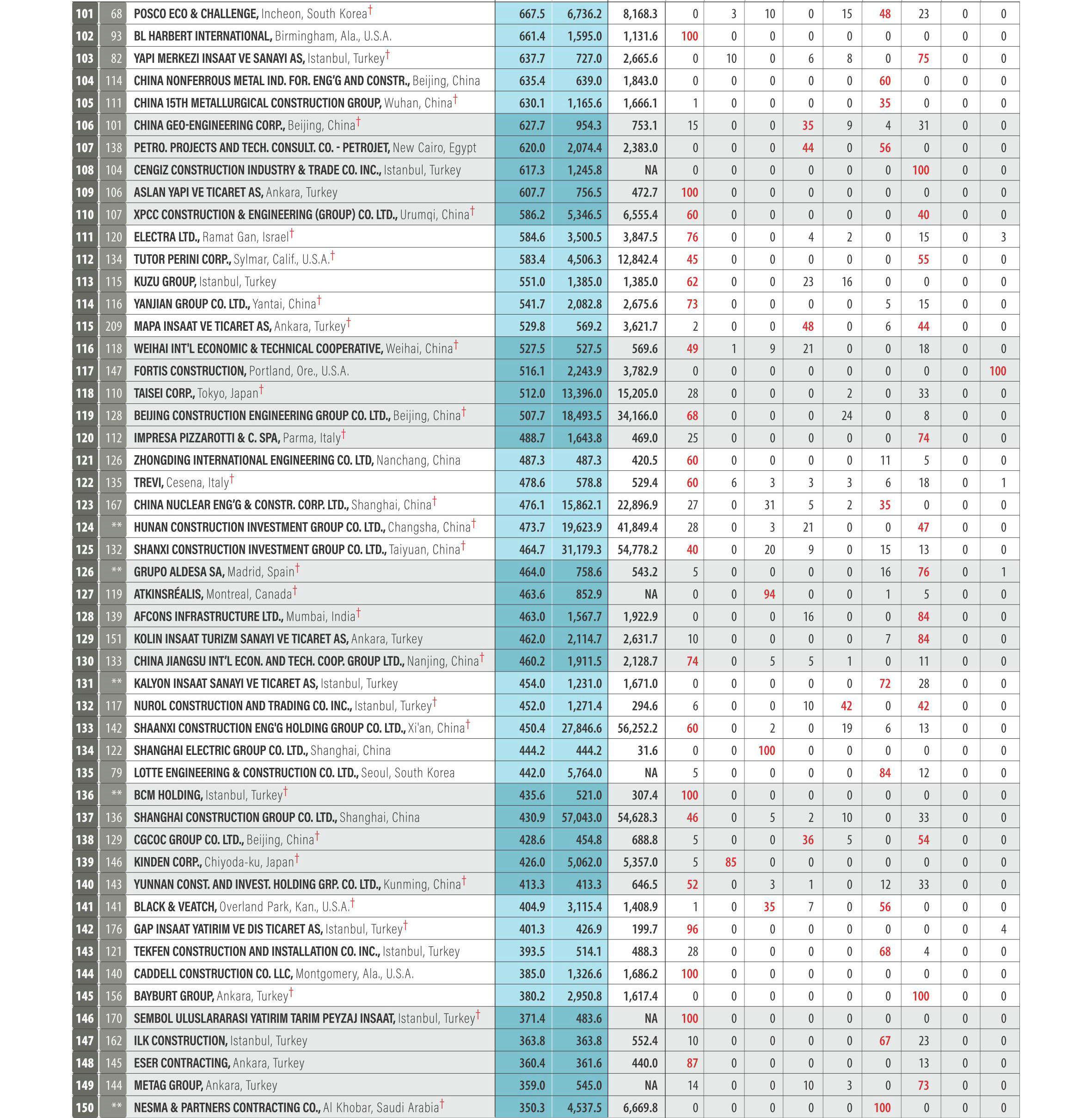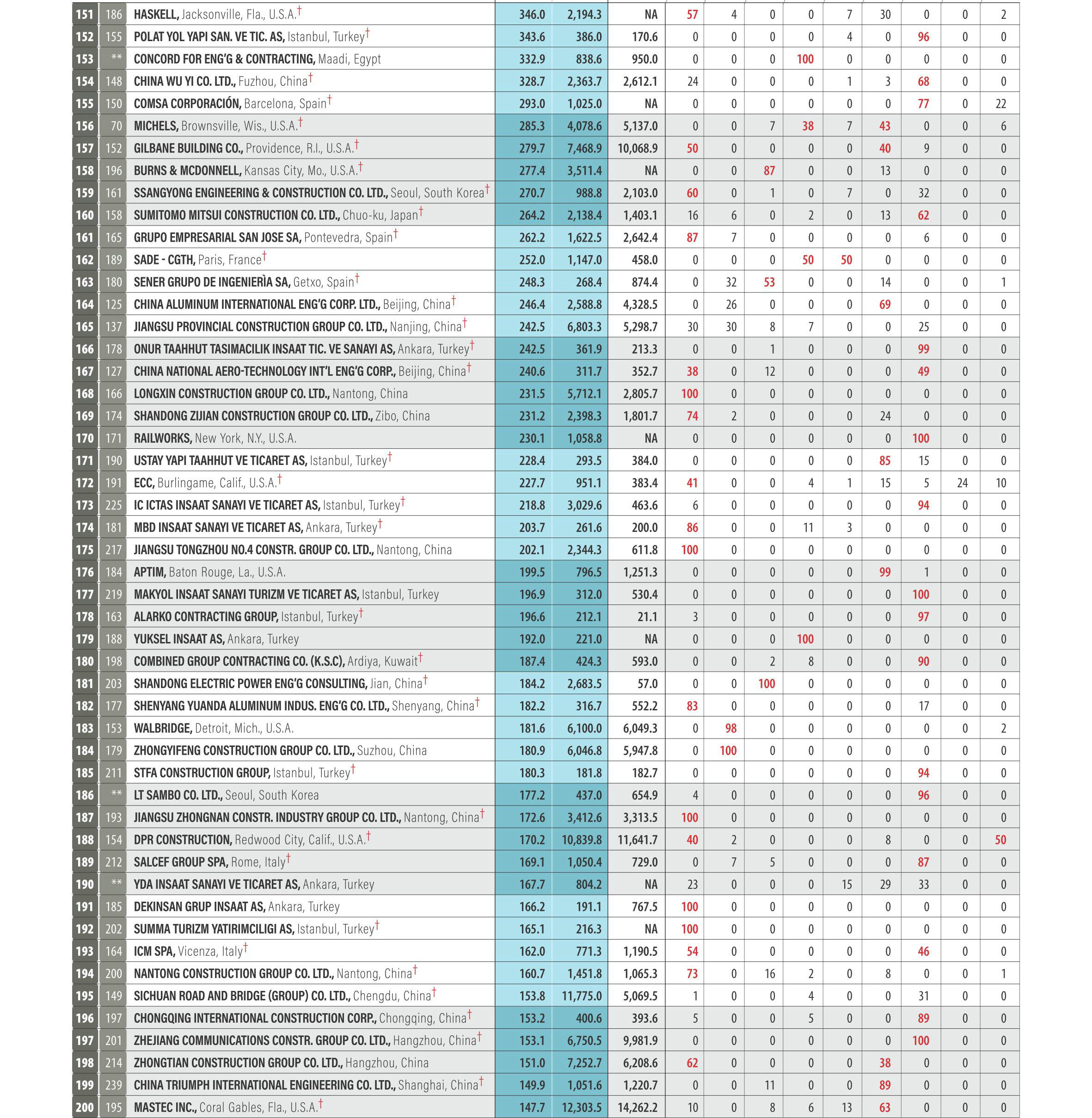 在ENR同期發(fā)布的“最大250家全球承包商”榜單中(以國內(nèi)與國際營業(yè)額合計(jì)排序),共7家中國企業(yè)進(jìn)入前10強(qiáng),與上年度持平,其中中國建筑、中國中鐵、中國鐵建、中國交建包攬前4位,中國電建排名第6位、中冶科工排名第7位、上海建工排名第8位。此外,中國能建、北京城建、山西建投、中國化學(xué)工程、陜西建工、湖南建投、北京建工、綠地大基建、中國核建、安徽建工、特變電工、中油工程、山東高速、浙江建投、四川路橋、東方電氣、上海城建等企業(yè)進(jìn)入榜單前50強(qiáng),體現(xiàn)了中國企業(yè)在全球基建行業(yè)的重要地位。