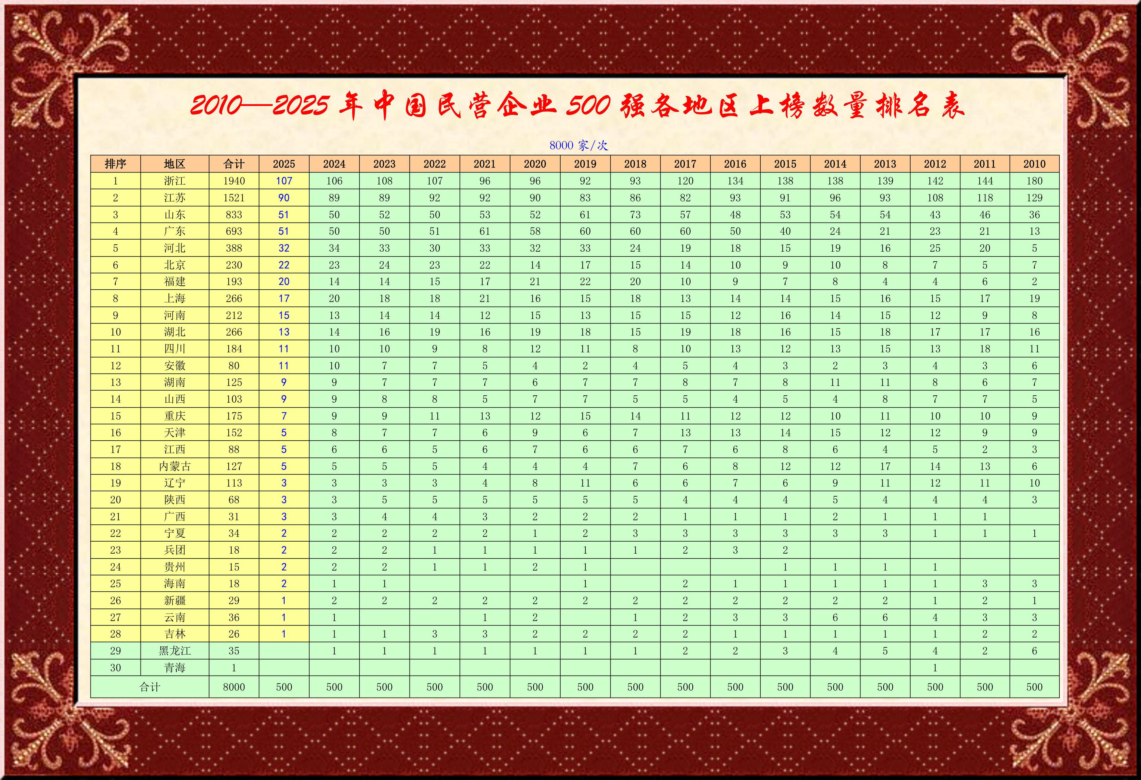 今年全國(guó)工商聯(lián)組織開(kāi)展第27次上規(guī)模民營(yíng)企業(yè)調(diào)研,共有6379家2024年?duì)I業(yè)收入10億元以上的企業(yè)參加,其中營(yíng)業(yè)收入前500位的企業(yè)為“2025中國(guó)民營(yíng)企業(yè)500強(qiáng)”。