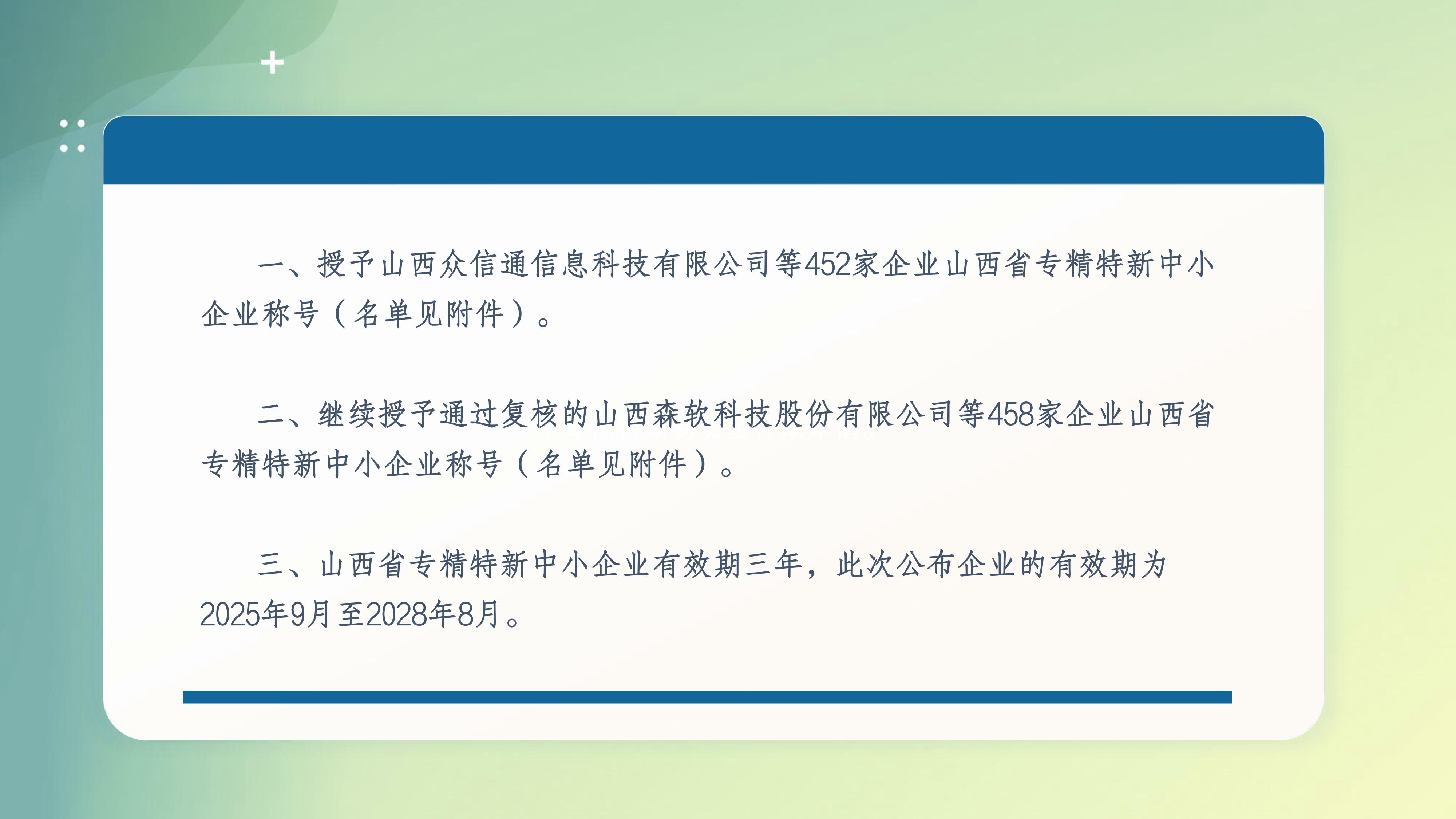 山西省專精特新中小企業(yè)有效期三年,此次公布企業(yè)的有效期為2025年9月至2028年8月。