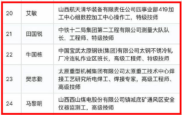 他們分別是:山西航天清華裝備有限責任公司四事業(yè)部419加工中心組數控加工中心操作工,特級技師艾敏;中鐵十二局集團第二工程有限公司測量大隊隊長,工程師、特級技師田國銳;中國寶武太原鋼鐵(集團)有限公司太鋼不銹冷軋廠冷連軋作業(yè)區(qū)班長,高級工程師、特級技師牛國棟;太原重型機械集團有限公司太原重工技術中心焊接工藝研究所電焊工、焊接專家,高級工程師、高級技師樊志勤;山西西山煤電股份有限公司鎮(zhèn)城底礦通風區(qū)安全儀器監(jiān)測工,高級技師馬黎明。