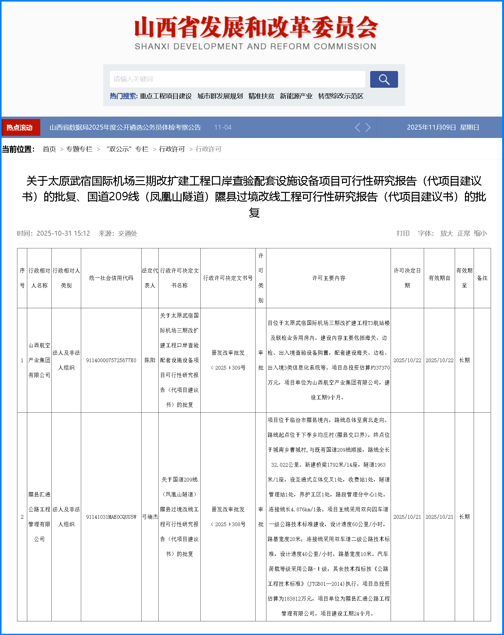 本報太原11月8日訊(記者張劍雯)近日,省發(fā)展改革委發(fā)布兩項交通領域重要批復:太原武宿國際機場三期改擴建工程口岸查驗配套設施設備項目、國道209線(鳳凰山隧道)隰縣過境改線工程可行性研究報告通過審批。兩項目總投資合計超22億元,分別從航空樞紐功能升級與縣域公路通行優(yōu)化兩大維度,為我省綜合交通運輸體系建設注入新動能。
