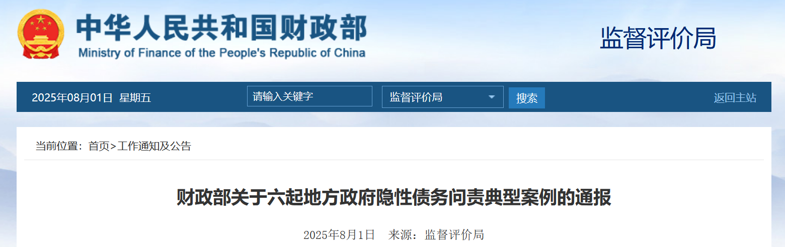 8月1日,財政部監(jiān)督評價局就六起地方政府隱性債務問責典型案例發(fā)布通報: