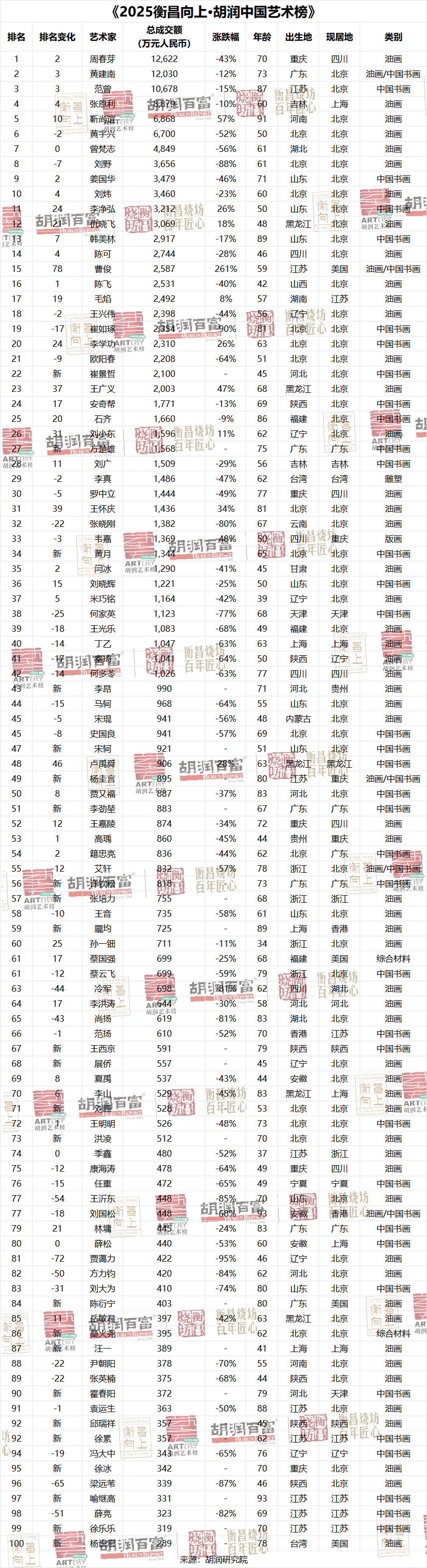 21位在世藝術(shù)家進(jìn)入《2025胡潤最暢銷中國藝術(shù)家》(前100名中國在世和已故藝術(shù)家)榜單,比去年少6位
