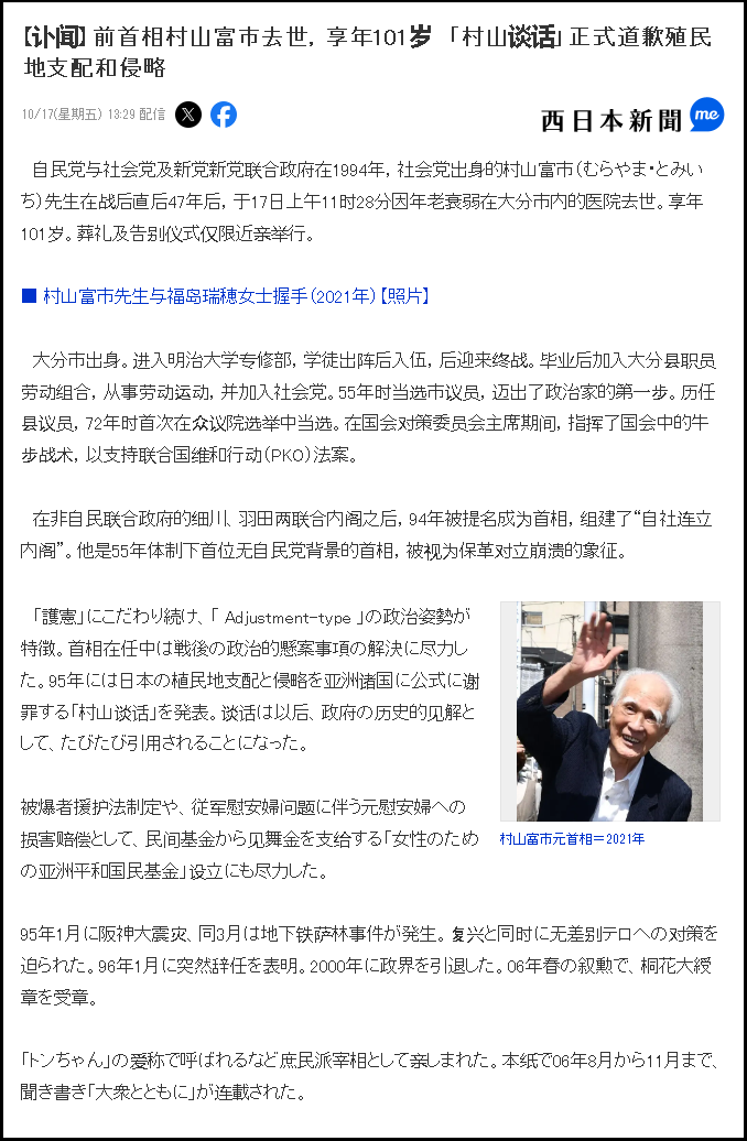 “作為一位富有正義感的政治家,村山富市先生為促進(jìn)中日友好事業(yè)所作出的貢獻(xiàn)將被永遠(yuǎn)銘記?!绷謩φf,今年是中國人民抗日戰(zhàn)爭暨世界反法西斯戰(zhàn)爭勝利80周年,“村山談話”是日本政府就過去那段侵略殖民歷史向亞洲受害國人民和國際社會作出的鄭重表態(tài)和承諾,應(yīng)當(dāng)予以恪守。