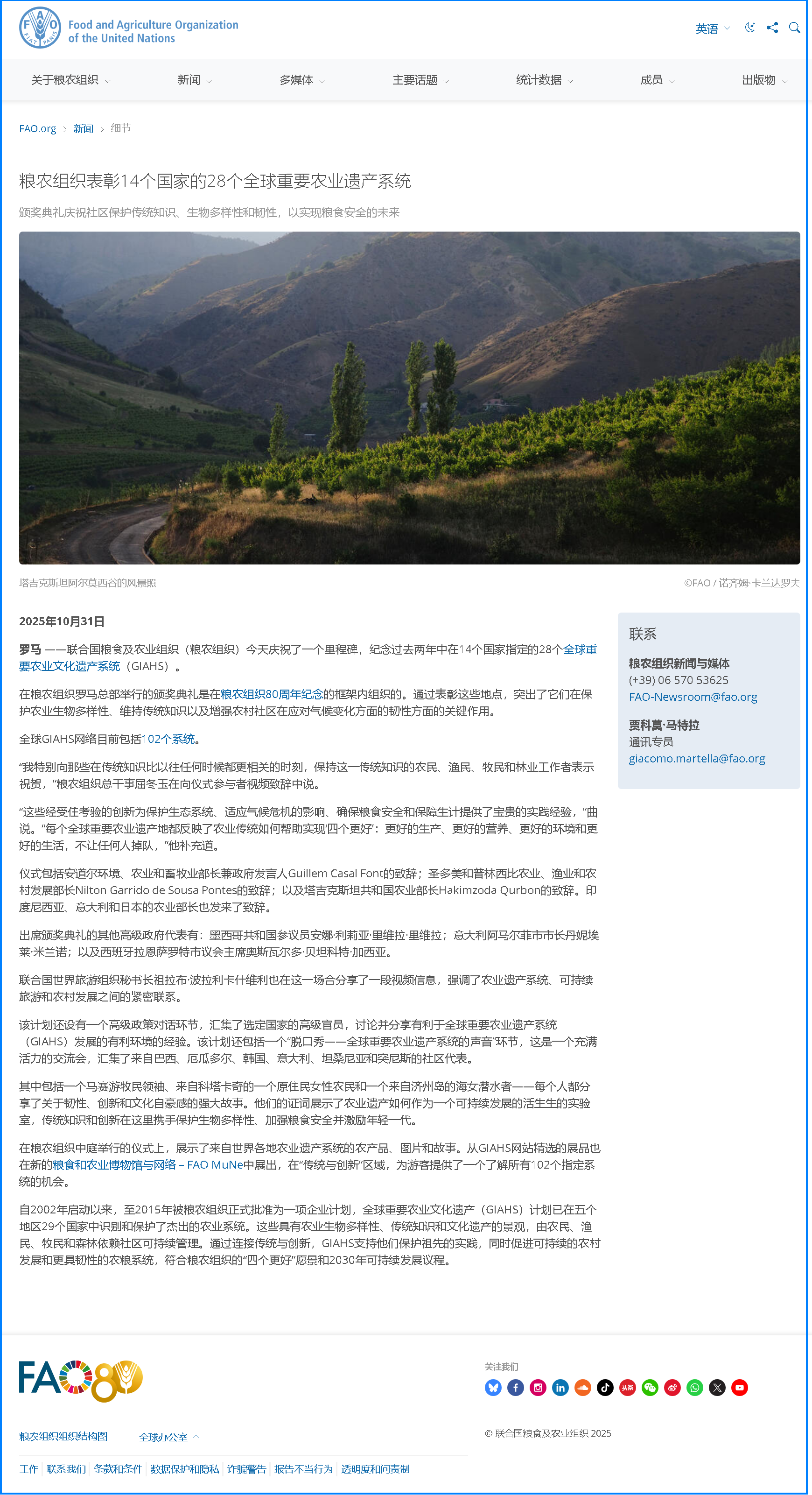 新華社羅馬10月31日電(記者刁澤)10月31日,由聯(lián)合國糧農(nóng)組織主辦的全球重要農(nóng)業(yè)文化遺產(chǎn)授牌儀式在意大利首都羅馬舉行。此次活動是糧農(nóng)組織成立80周年系列活動之一,為2023年以來新認定的全球重要農(nóng)業(yè)文化遺產(chǎn)舉辦集中授牌與交流。