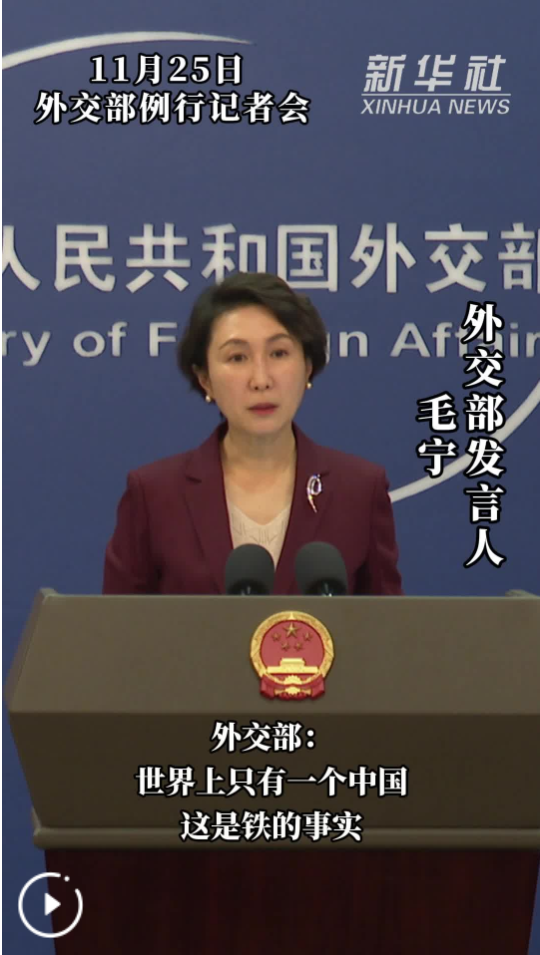 新華社北京11月25日電(記者劉楊、馮歆然)外交部發(fā)言人毛寧25日表示,世界上只有一個中國,臺灣是中國領土不可分割的一部分,這是鐵的事實,不容歪曲篡改。