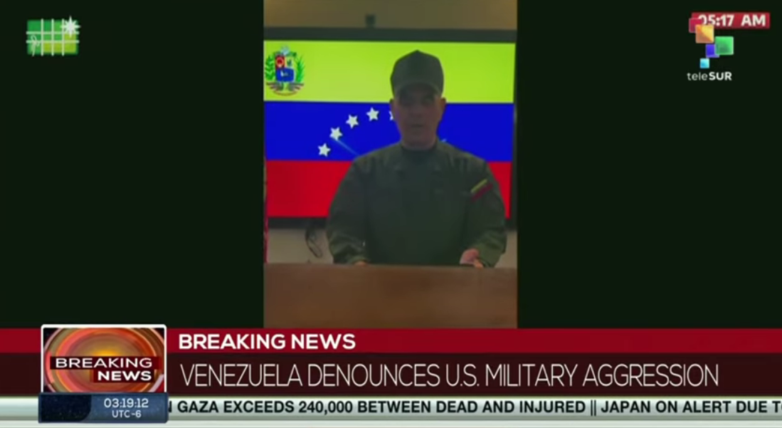 委內(nèi)瑞拉國(guó)防部長(zhǎng)洛佩斯在社交媒體發(fā)布視頻講話。委內(nèi)瑞拉國(guó)家電視臺(tái)西班牙語(yǔ)頻道TeleSUR視頻截圖