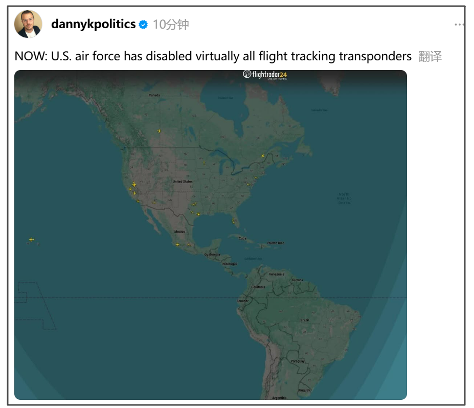 社交媒體消息顯示,根據(jù)實(shí)時(shí)航班追蹤器FlightRadar24信息,整個(gè)美國(guó)空軍幾乎關(guān)閉了所有飛行跟蹤應(yīng)答器。