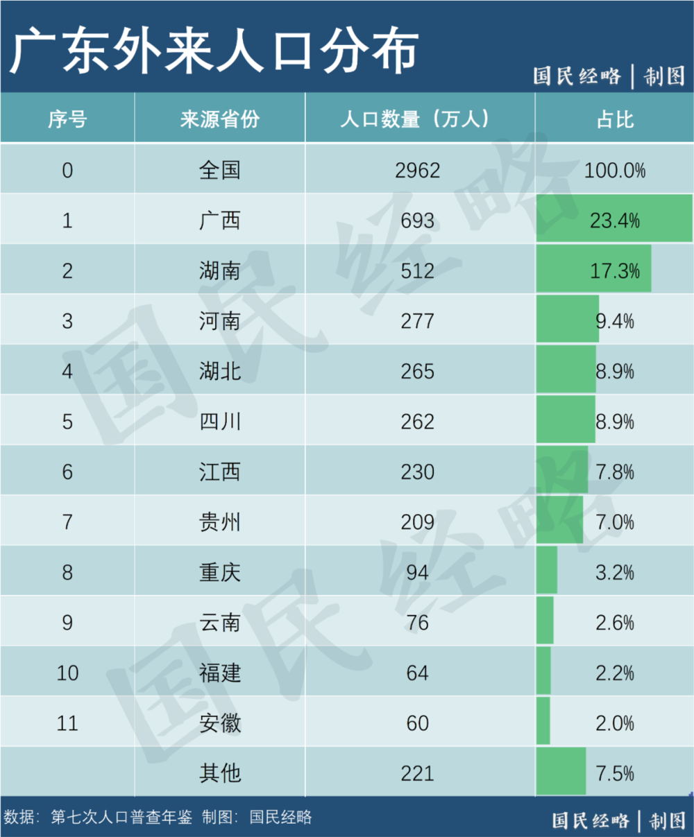 廣東的人口虹吸效應(yīng),遍及整個“泛珠三角地區(qū)”,每8個廣西人、每13個湖南人就有1個來到了廣東。
