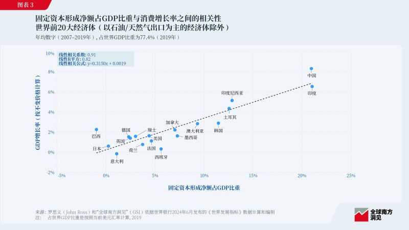 固定資本形成凈額占GDP比重與消費(fèi)增長高度相關(guān),且經(jīng)濟(jì)規(guī)模越大相關(guān)性越強(qiáng)