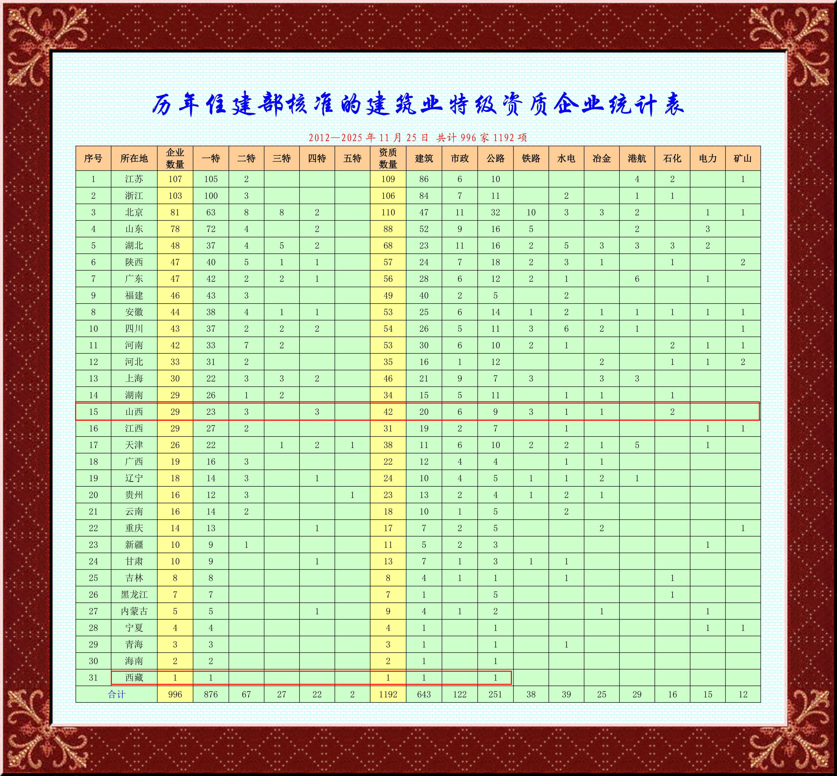 隨著住建部第十一批核準(zhǔn)建設(shè)工程企業(yè)資質(zhì)名單公布,西藏自治區(qū)誕生第一家特級(jí)資質(zhì)建筑業(yè)企業(yè),全國(guó)31個(gè)省市區(qū)建筑業(yè)第一方陣企業(yè)已近千家!