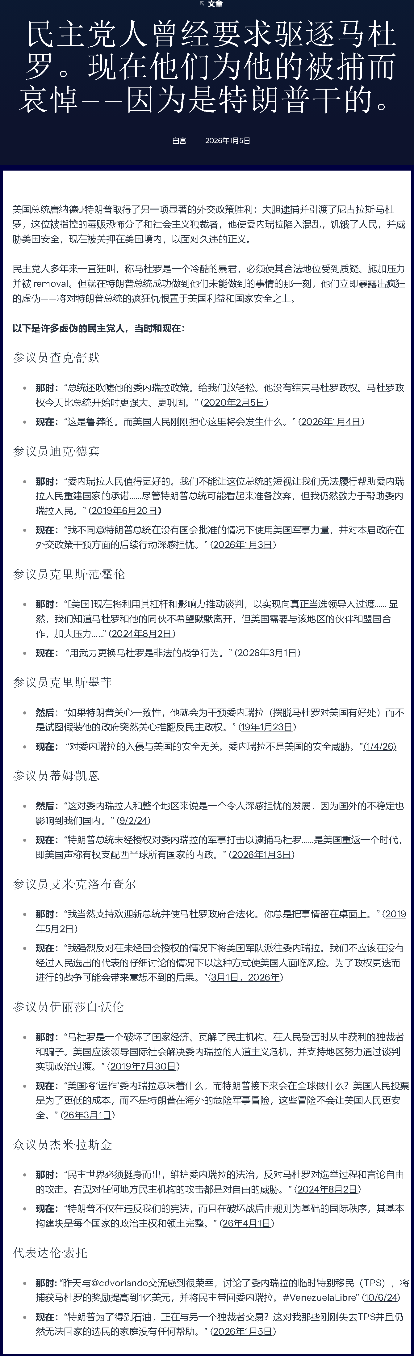 現(xiàn)在:“特朗普總統(tǒng)未經(jīng)授權(quán)對(duì)委內(nèi)瑞拉的軍事打擊以逮捕馬杜羅……是美國(guó)重返一個(gè)時(shí)代,即美國(guó)聲稱有權(quán)支配西半球所有國(guó)家的內(nèi)政?!?(2026年1月3日)