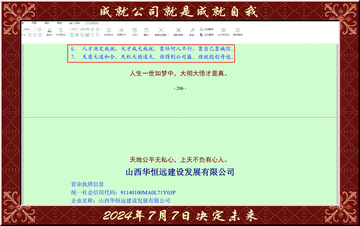如何成就自我,如何成就公司,這個問題是人生事業(yè)的首要問題。以德立身,以勤立家,以誠立命,以信立業(yè),以義立行,五行相生,可謂人生事業(yè)之大道,人生事業(yè)之正道。秉持奉行,傳承發(fā)揚(yáng),堅(jiān)持一貫,持之以恒,兩個“成就”自然如囊中取物,伸手便來。這就是事物規(guī)律和人生法則,也可以說是成功的密碼和鑰匙。